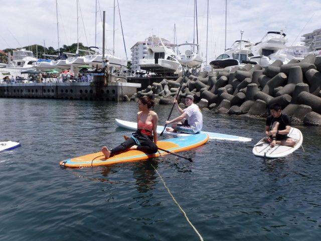 初めてスタンドアップパドルに挑戦する彼女もインサイドの足の着く砂場エリアで基礎練習をちょっとやって、感覚を掴んできたら