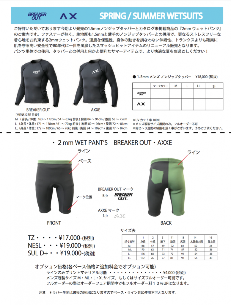 ハイサマー ウエットスーツ お知らせ 2019.06.22 だんだんと夏になってきましたね〜 既製の薄手のウエットスーツが登場 1.5mm タッパーは背中にポッケっトがついています! ウェットパンツはフルオーダーも可能です。