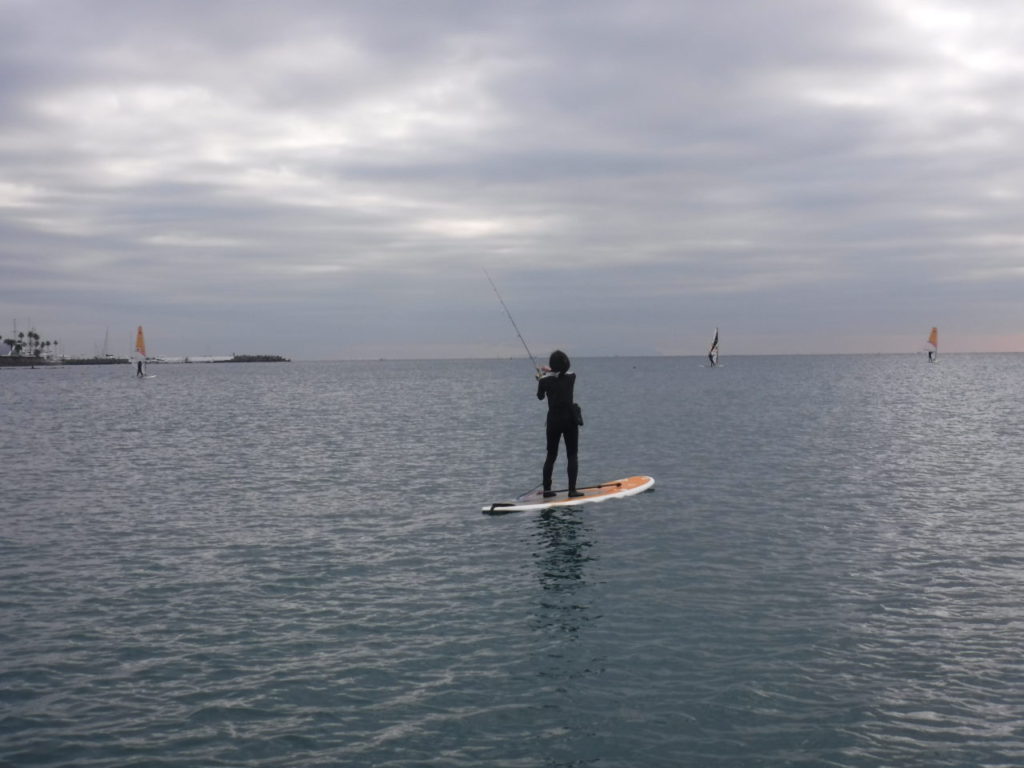 午前は風が強そうなので、お昼に集合して、SUPで釣り