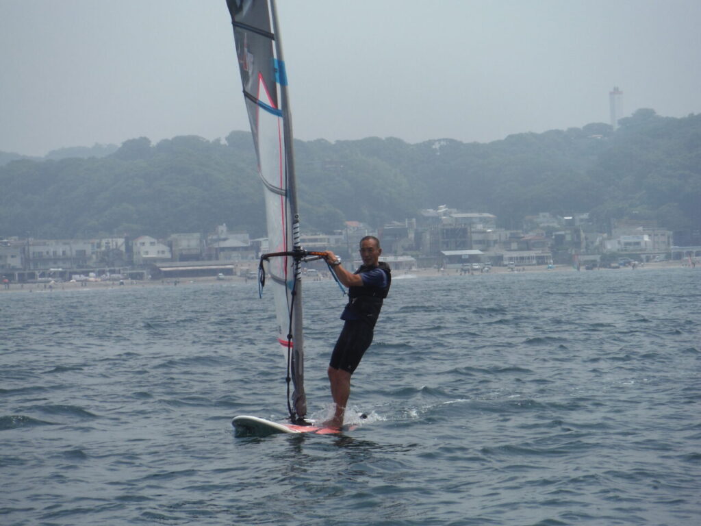風は南が4-5メートルぐらいで予報より入っててアンヒールで上る練習、タック、ジャイブ練習をしました。
