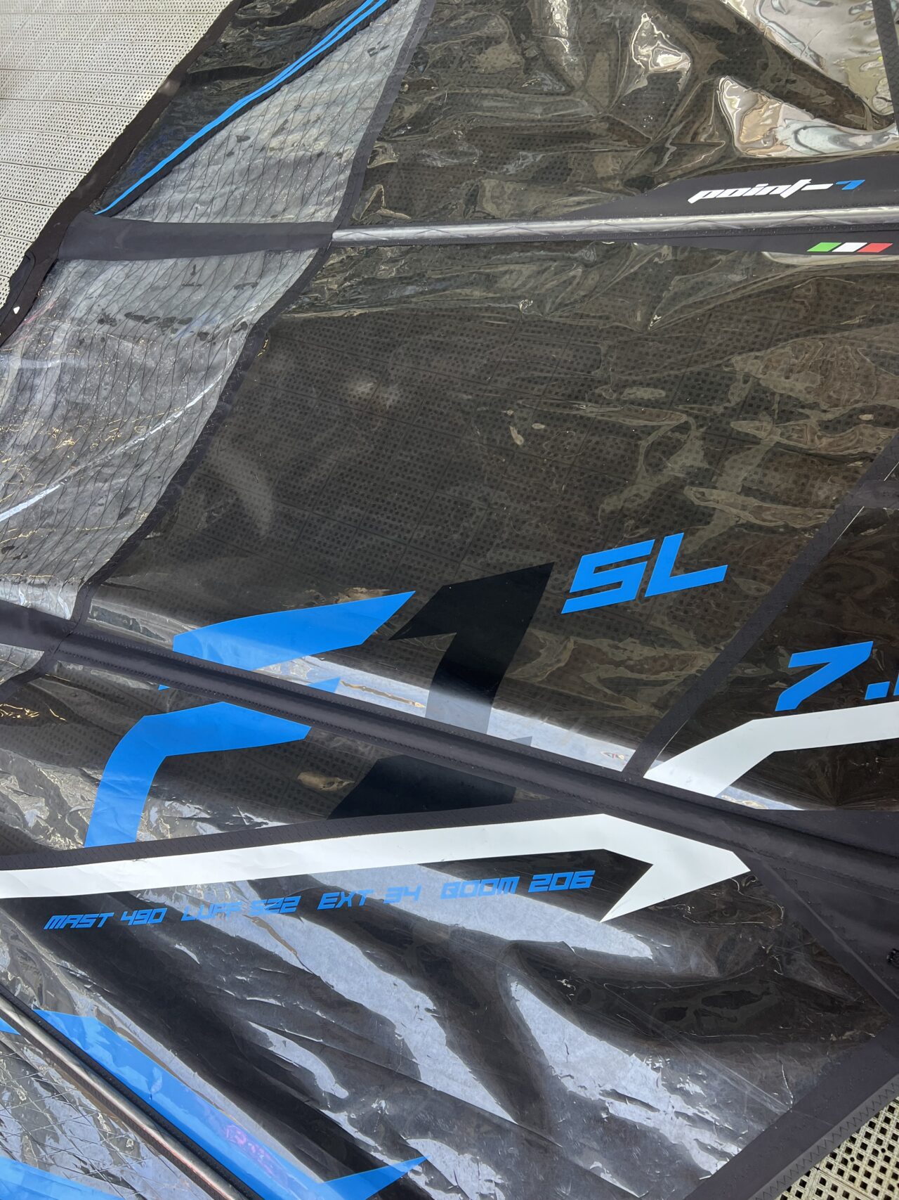 マストのファスナーのところが破れがありますが問題なく使用できます。1番下のバテンの上のところ、スリーブのところに1cmくらいの破れが4箇所あり補修シールが貼ってあります。
